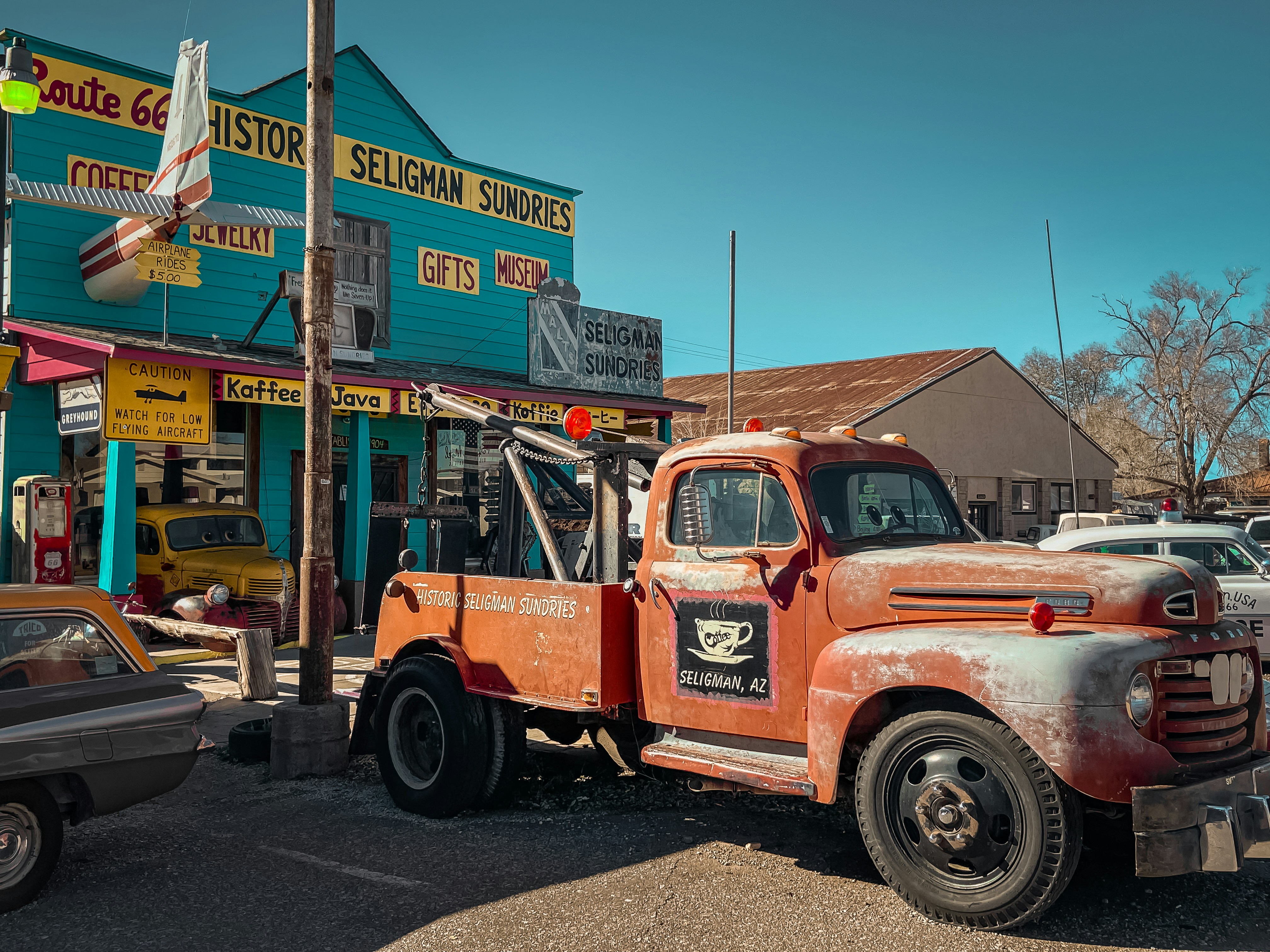 「ルート66の心臓部」と呼ばれる大きな町。ここにある「アリゾナ・ルート66博物館(Powerhouse Route 66 Museum)」は必見です。ルート66の歴史、大恐慌時代、そして復活までの道のりが詳しく展示されています。 向かいにあるダイナー「Mr. D’z Route 66 Diner」で、アメリカンサイズのミルクシェイクを頼むのもお忘れなく。色は強烈ですが、味は意外と繊細で美味しいです。