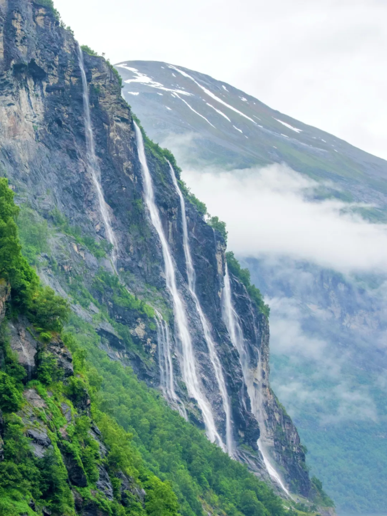 ガイランゲルフィヨルドの全長はわずか16キロメートル。山道を車で走ると、両岸には霧が立ち込め、標高1500メートル以上の山々には無数の滝が隠れています。中でも最も有名なのが七姉妹の滝です。