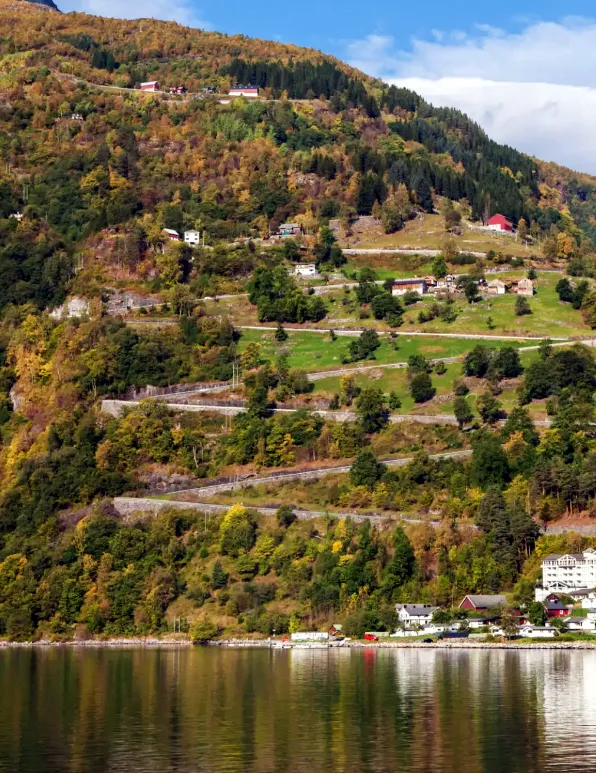 ガイランゲルフィヨルドの北東側の山腹に沿って走る「ワイルドな展望ロード」。わずか7kmの区間に11もの連続ヘアピンカーブ。その名の通り、まるで鷲のようにフィヨルドを見下ろせる絶景ルートです。