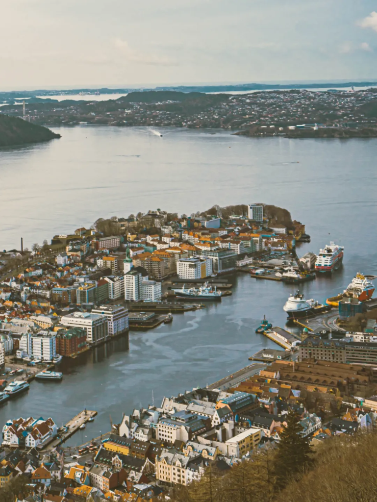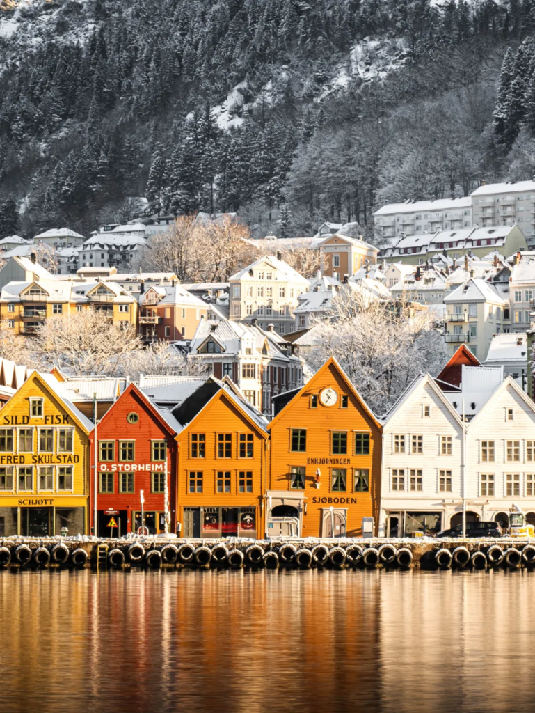 ノルウェー第2の都市ベルゲン。美しい港町で、7つの山とフィヨルドに囲まれた「七つの山の街」として知られています。しっとりとした空気と、カラフルな木造家屋が織りなす景色は、まさに北欧ロマンです。