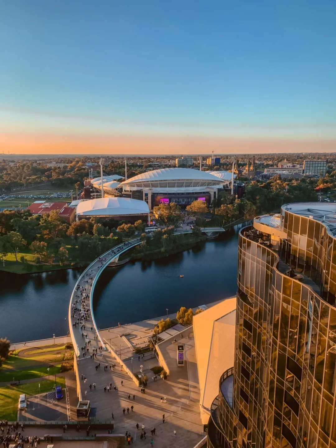 近くのトレンズ川はアデレード・オーバル(Adelaide Oval)を映し出します。ここは「世界で最も美しいクリケットスタジアム」と称されます。地上から屋上へと登り、360°の眺望で街を一望すれば、アデレードの壮大な景色と唯一無二の視点を楽しめます。