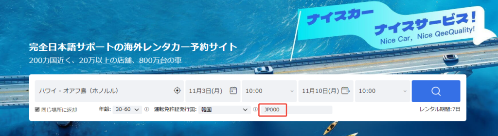 予約時にプロモーションコード 「JP000」 を入力すると、他の割引に加えて追加5%OFF!
